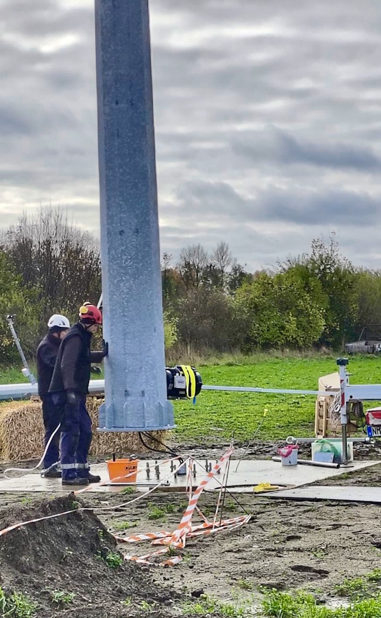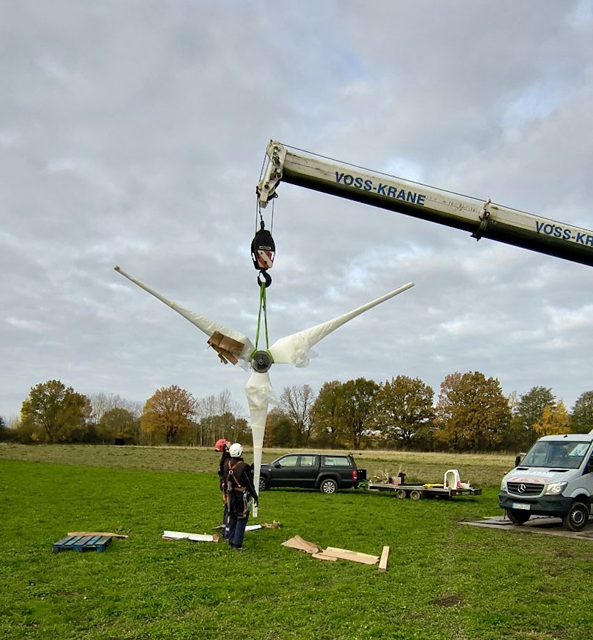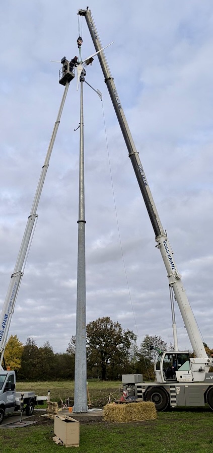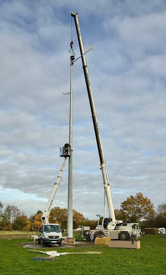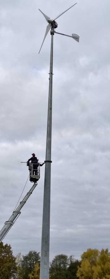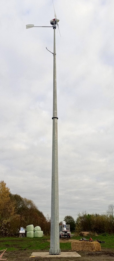 Unsere größte WKA, die Antaris 12.0 kW Kleinwindanlage (Ø 6,50 m), steht stolz auf einem 24 m hohen Mast und verwandelt die Kraft der Natur in saubere Energie.